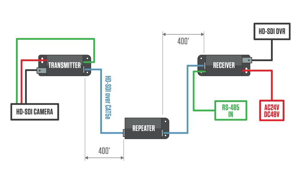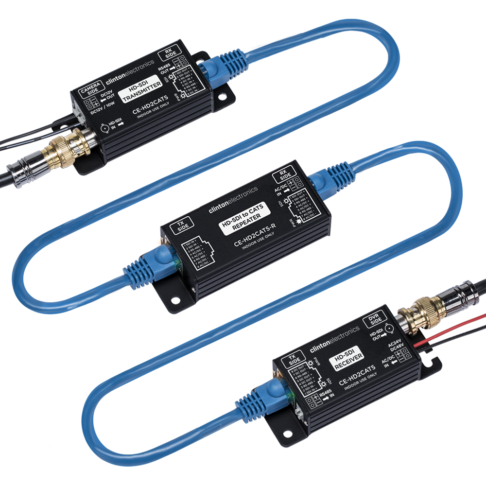 The CE-HD2CAT5-R Repeater enables an HD-SDI signal, power, and RS-485 data to be repeated an additional 400’ when using the CE-HD2CAT5 Transmitter and Receiver.